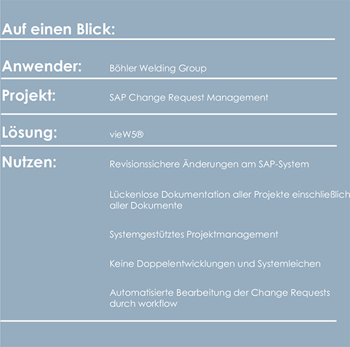 Bei der Suche nach einer Alternative hat sich Böhler Welding für vieW5® von INTENTIO entschieden. vieW5® erfüllte alle Anforderungen von Böhler Welding an ein modernes Tool zum Change Request Management in SAP.